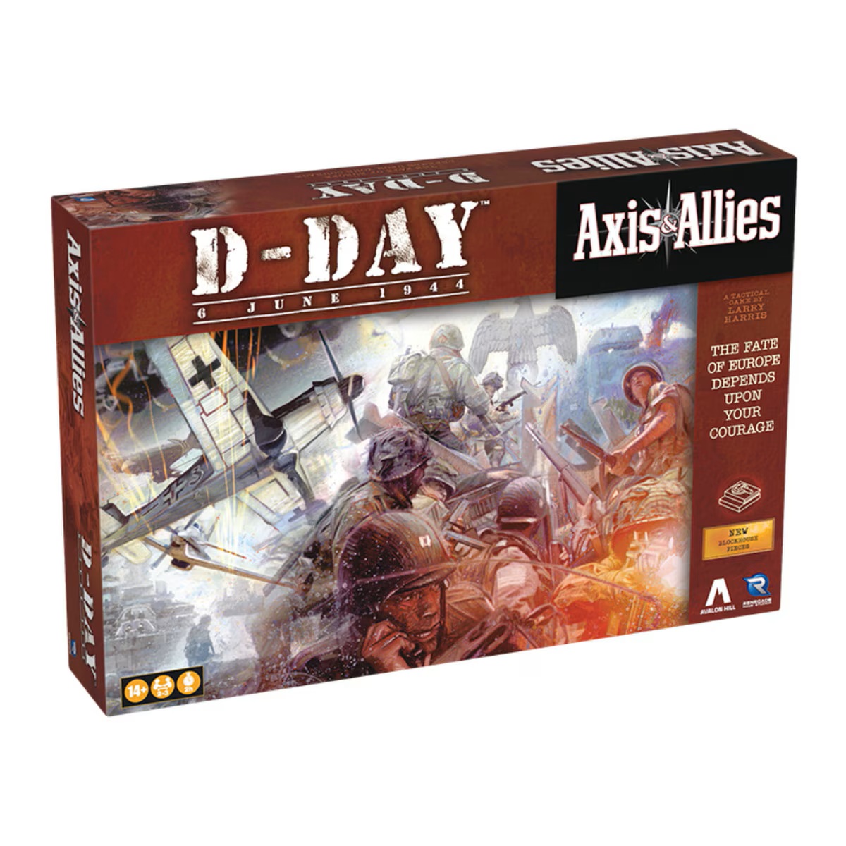 Axis & Allies D-Day features detailed game components including a new blockhouse piece, an extra-large game board, and original artwork commissioned exclusively for the D-Day game box. Other elements of this new Axis & Allies variant include a card deck with three card types — Orders, Tactics, and Fortune — to add depth and complexity to play. Order cards determine play sequence and break turns into distinct phases; Tactics cards offer players varied strategic opportunities; and Fortune cards add an element of unpredictability.