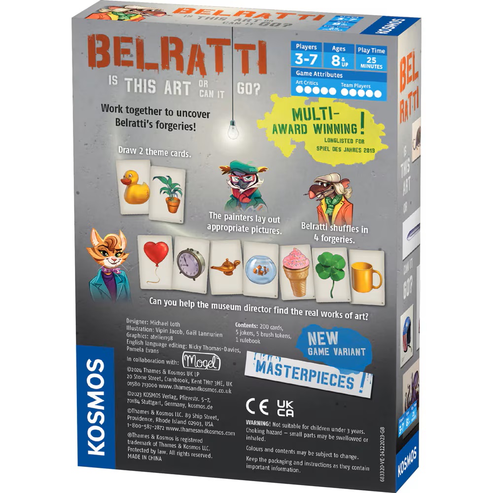 In Belratti, players are split into two roles — buyers and painters — and are playing against the game. The game presents two cards as topics for which the buyers need to buy paintings. They ask for a certain number of cards, and the painters have to collectively meet this target number.