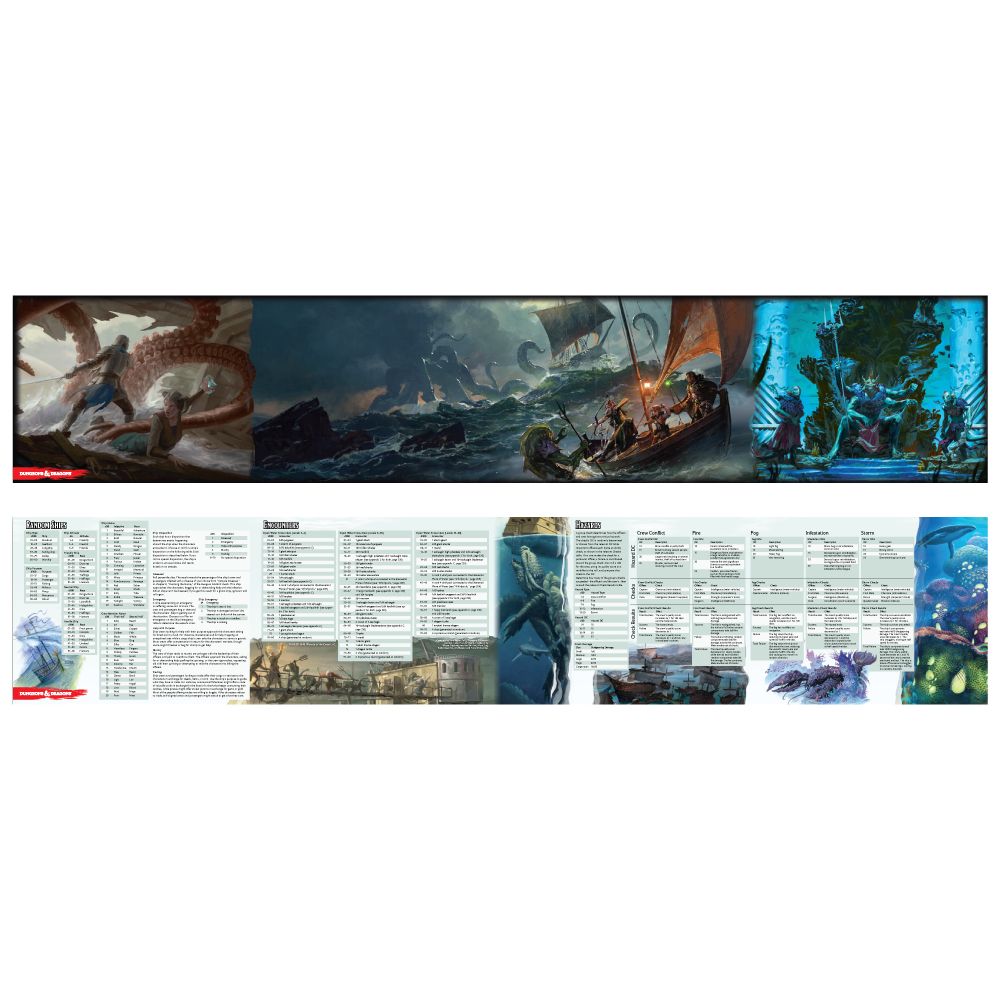 The evocative front displays a variety of scenarios your heroes may find themselves in, from a kraken attack to a meeting with a sahuagin baron. On the back you will find a variety of references to help you in the running of your sea escapades, such as random ships and seafaring hazards.