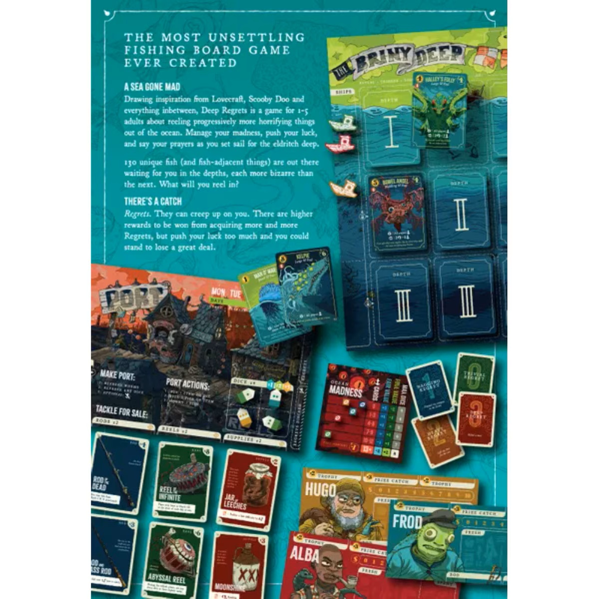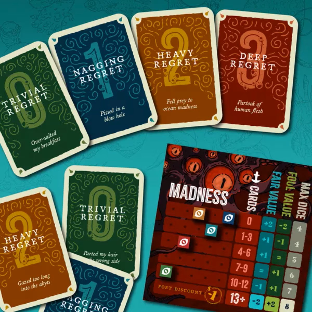 As your eyes spy more and more horrifying things, you’ll collect Regrets cards – which drive up your madness but also give you access to more dice and increase the value of weirder fish. It’s a risk/reward scenario as you balance your madness, knowing that at the end of the game the player with the highest value of Regrets will have to discard their most valuable mounted fish.