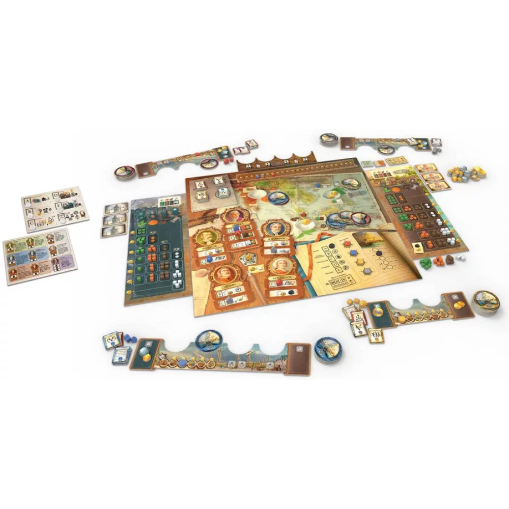 In East India Companies, players manage a large shipping company that trades with far flung trading posts in India. They must manage their ships and invest in buying shares of their own company or those of their competitors. Most importantly, players have to keep an eye on the constantly fluctuating market prices! Is it better to invest your money in the stock market or in buying goods? Do they prefer to use fast ships with low tonnage or slower ships with larger holds? Whatever the players choose, their strategies will influence those of their opponents.