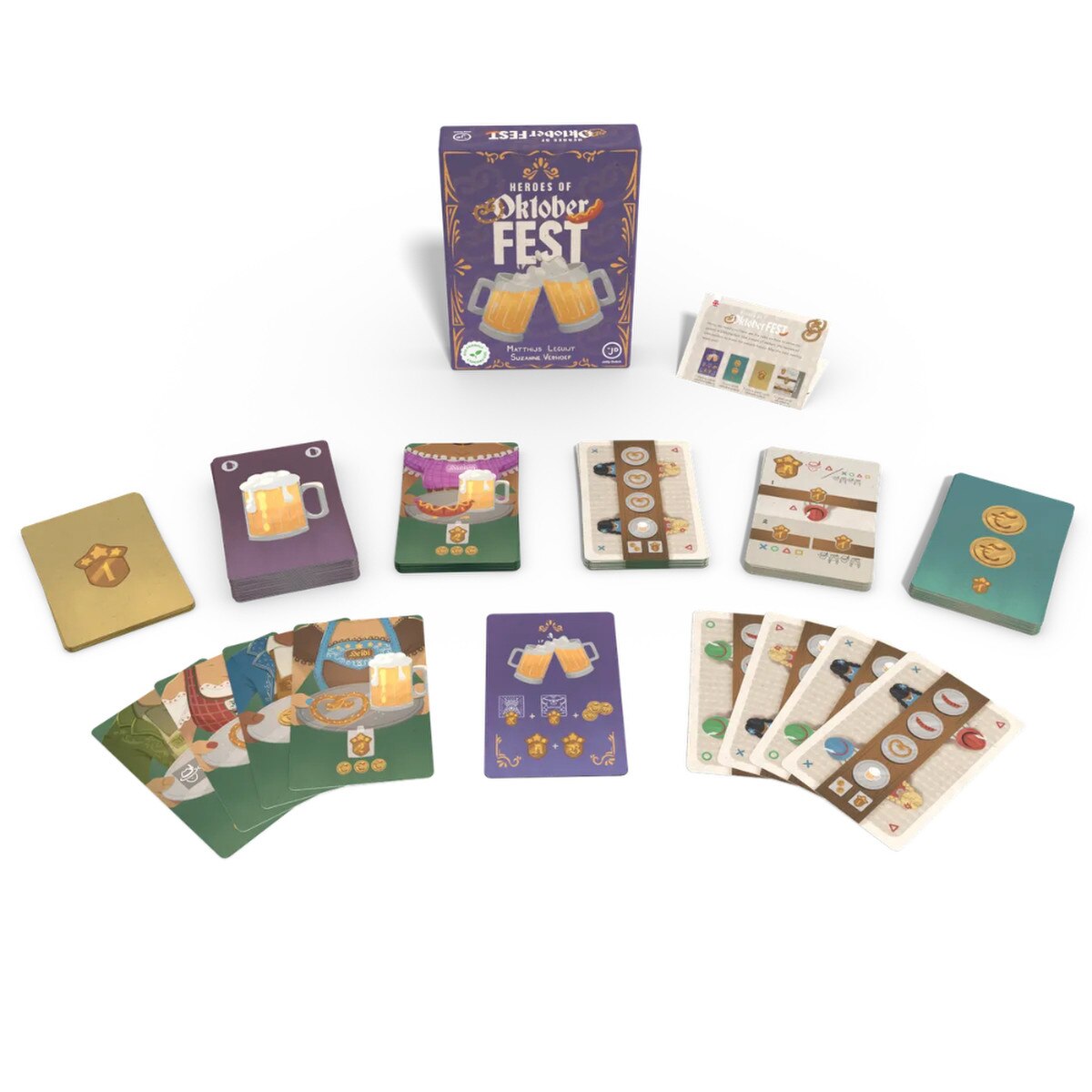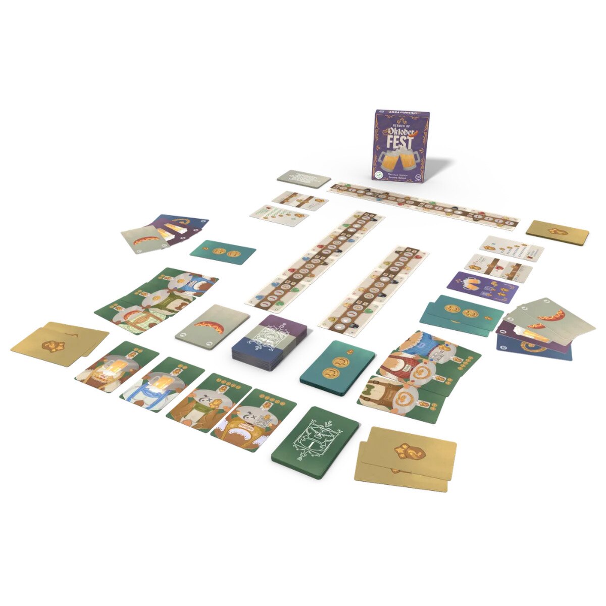 In Heroes of Oktoberfest you score victory points by serving tables, hiring heroes and placing guests in the desired places. By serving tables with the right combinations of pretzels, beer and sausages, a lively atmosphere is created in the center of the table. The colorful guests around the rows of tables score points if they sit in the correct order on your side. Choose and place each table with great care to make it a real party.