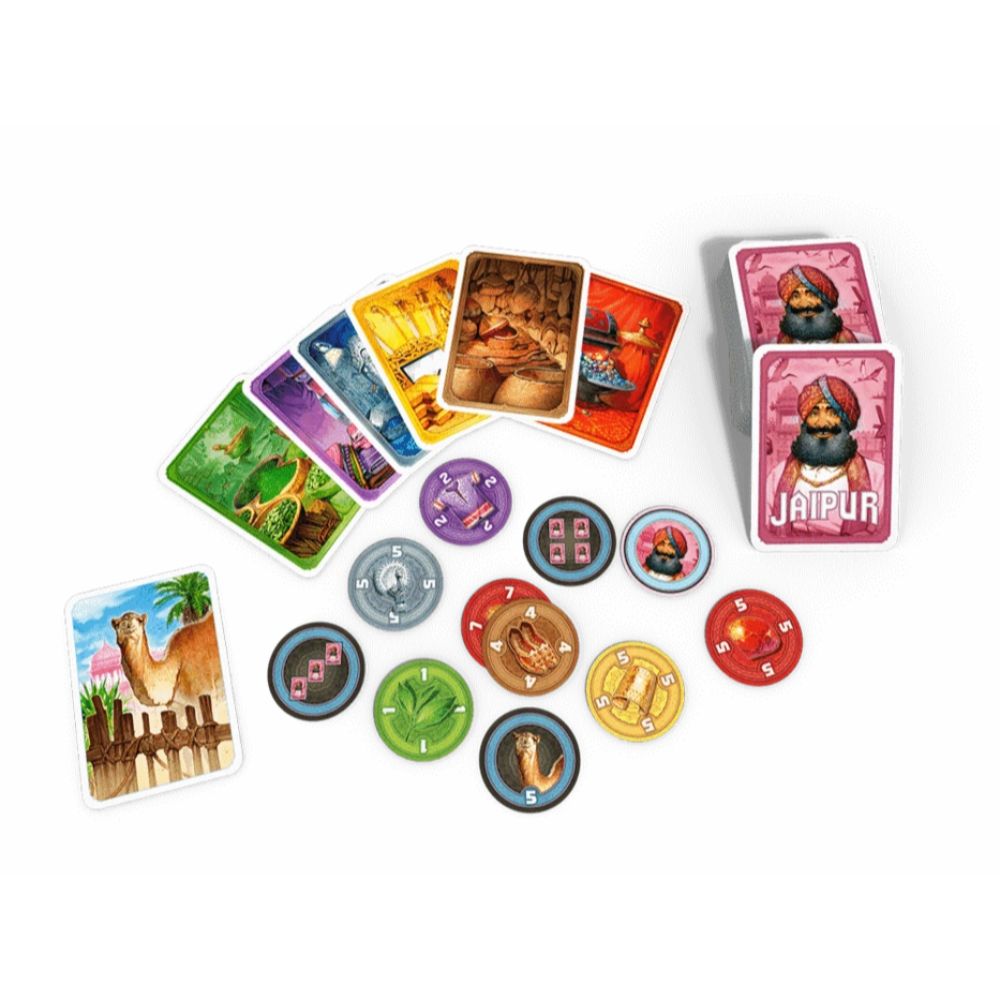 You are one of the two most powerful traders in the city of Jaipur, the capital of Rajasthan, but that’s not enough for you because only the merchant with two “seals of excellence” will have the privilege of being invited to the Maharaja’s court. You are therefore going to have to do better than your direct competitor by buying, exchanging, and selling at better prices, all while keeping an eye on both your camel herds. Jaipur is a fast-paced card game, a blend of tactics, risk and luck. On your turn, you can either take or sell cards. If you take cards, you have to choose between taking all the camels, taking one card from the market, or swapping 2-5 cards between the market and your cards. If you sell cards, you get to sell only one type of good, and you receive as many chips for that good as the number of cards you sold. The chips’ values decrease as the game progresses, so you’d better hurry! On the other hand, you receive increasingly high rewards for selling three, four, or five cards of the same good at a time, so you’d better wait! You can’t sell camels, but they’re paramount for trading and they’re also worth a little something at the end of the round, enough sometimes to secure the win, so you have to use them smartly.