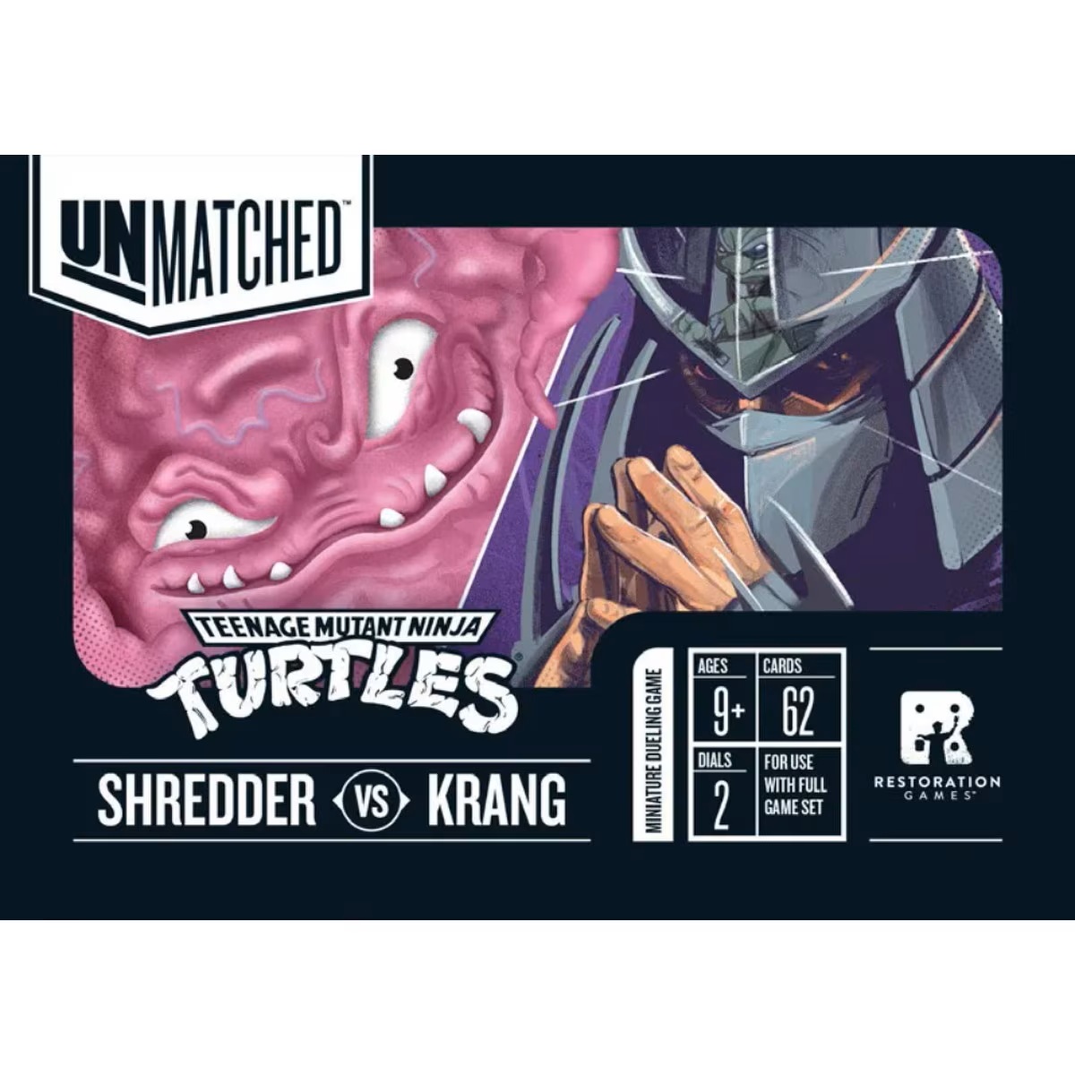 Now, you’re in control. Shredder uses waves of Foot soldiers (and his loyal sidekicks, Bebop and Rocksteady) to control the battlefield. The inscrutable Krang uses the Die of Ultimate Destruction for unpredictable results — something only an IQ of 968 could comprehend. Includes 1 character card and 30 action cards for each of the villains for competitive play.